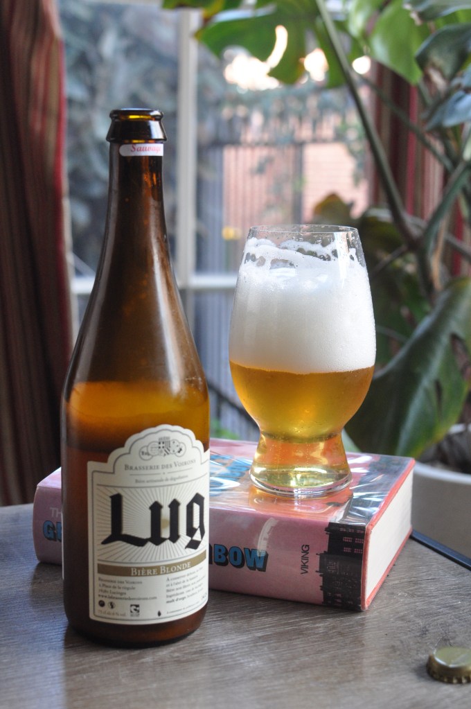 My French beer, as it happens, is actually good. This “Lug Blonde” from Brasserie des Voirons provides a firm rebuttal to Pynchon’s slander. It’s a bright light straw coloured saison with a big rocky fluffy white head. It tastes of lemon, orange, hay, white pepper, clove, and sage. It’s effervescent, soft, and crisp—thoughtful but totally refreshing. Just the kind of thing I like. Not even a little bit septic.