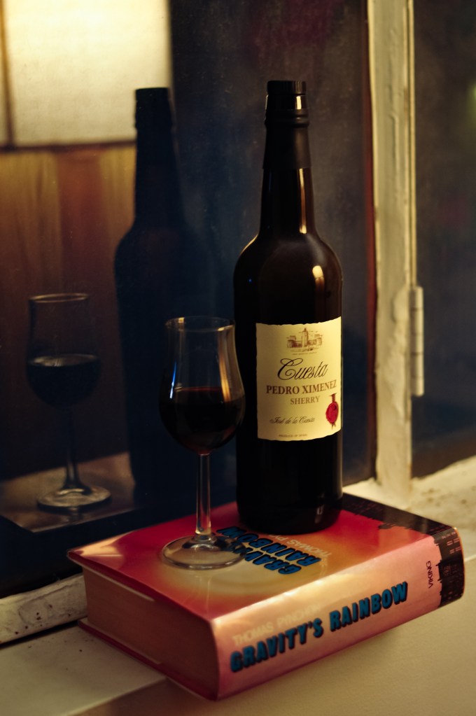 No one thus far has drunk sherry in a Pynchon novel that I have noticed. But sherry’s ghost does linger by a window during the Rathenau séance early in Gravity’s Rainbow. Milton Gloaming is telling Jessica about his statistical analysis of the paranormal investigations; Jessica’s “mad young gentleman” Roger is off in another room with Pirate Prentice: