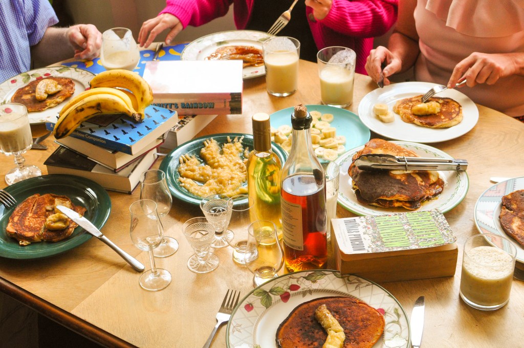 To flame (or let’s go with flambé) the bananas, I followed something like this recipe, with the crucial upgrade of swapping really ancient brandy in for rum. I cut the bananas lengthwise, browned them in a pan with some sugar, then sloshed in the brandy and lit her up. The pan burned blue for a good few minutes. We served the resultant caramelised bananas and sticky brandy sauce atop banana pancakes. They were glorious.
