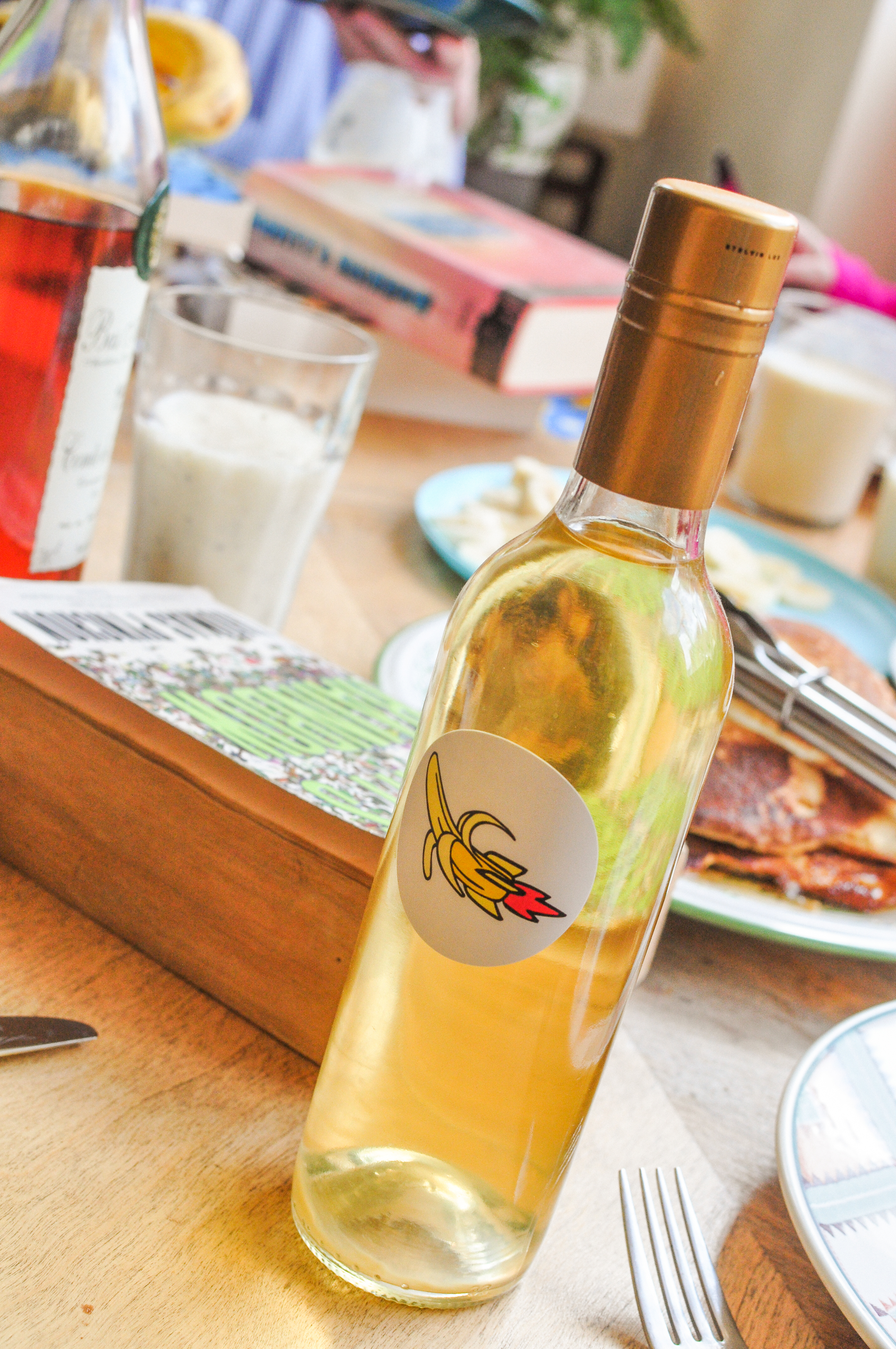 I bottled it in these snazzy little half wine bottles with gold tops and a label combining three key Gravity’s Rainbow motifs: bananas, rockets, and phalluses.