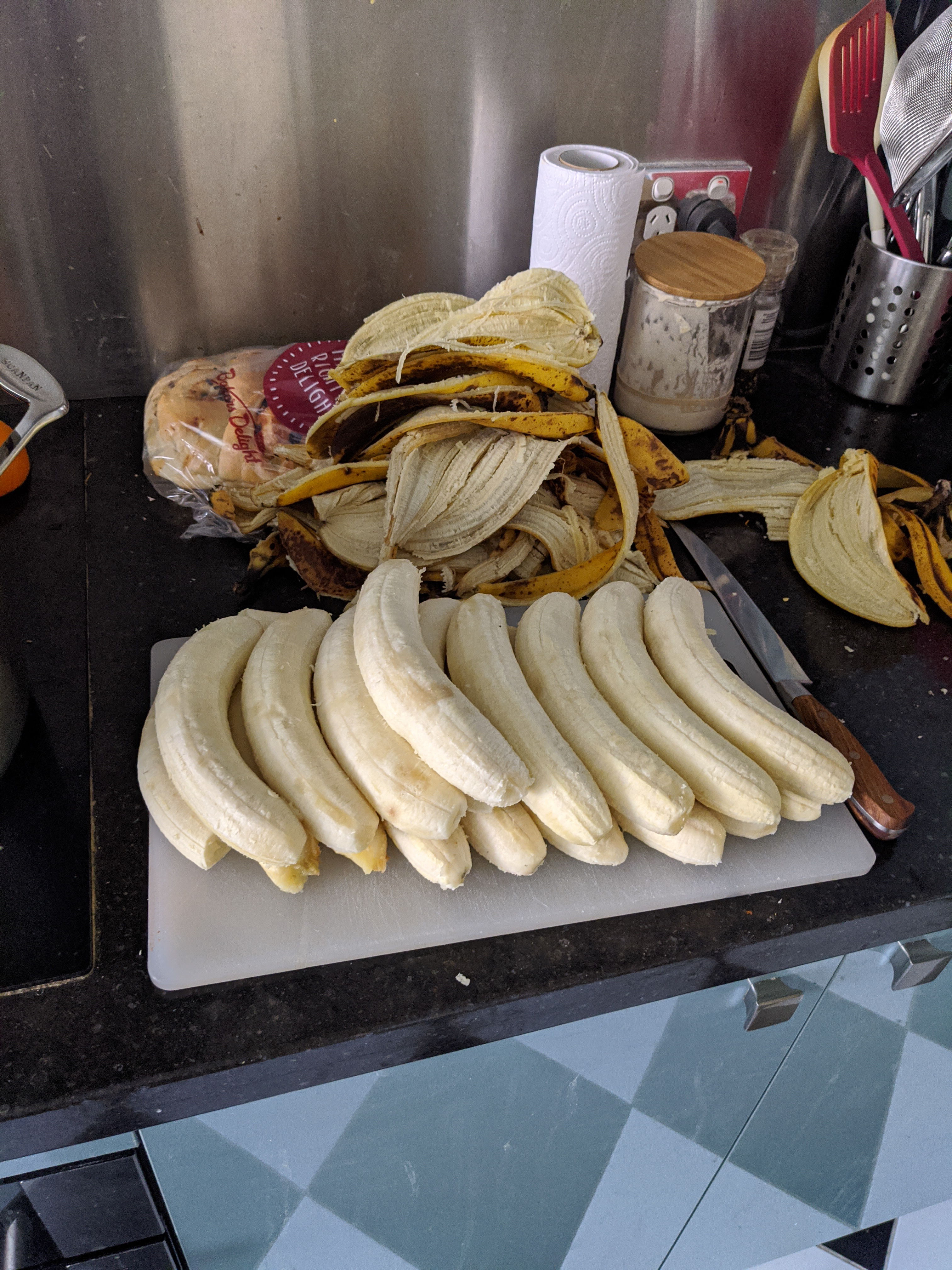 1. Simmer three large bunches worth of bananas (~1.5 kg) into a goop.