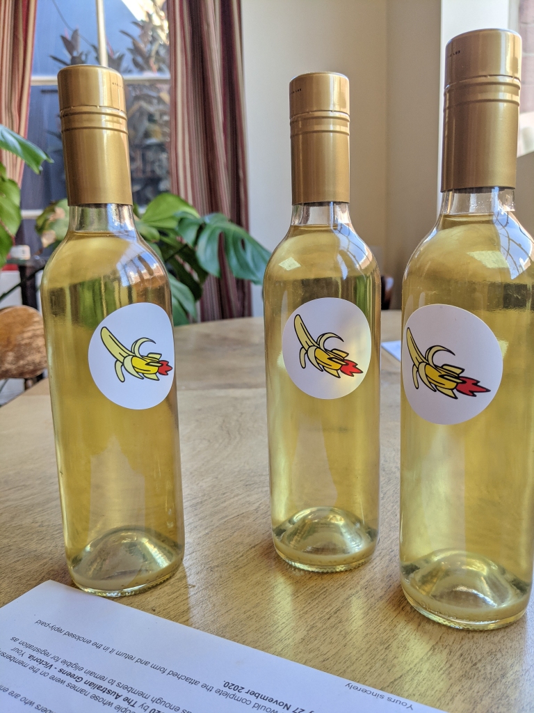 The finished mead has an intense banana aroma with notes to me suggestive of the banana skins, along with a good dose of spicy alcohol. I was a little worried along the way that all the banana would ferment out and fade away, but nope, this has held onto enough bananas to perfume at least half of Chelsea. The taste follows through, balancing a fiery alcohol spice with potent banana flavour and floral honey, plus more spice from that honey I added to backsweeten. It’s pretty dry, but with enough sugar to keep it drinkable. Unlike Pirate’s frothy stuff, I’ve kept it still. The whole package is pretty aggressive, but I’m into it. I will concede it didn’t gain many fans at ten in the morning during our banana breakfast, but it goes a lot better at a more mature hour. It’s a complex, not-too-sweet banana liqueur. (Perhaps we should put some in another King Kong??)