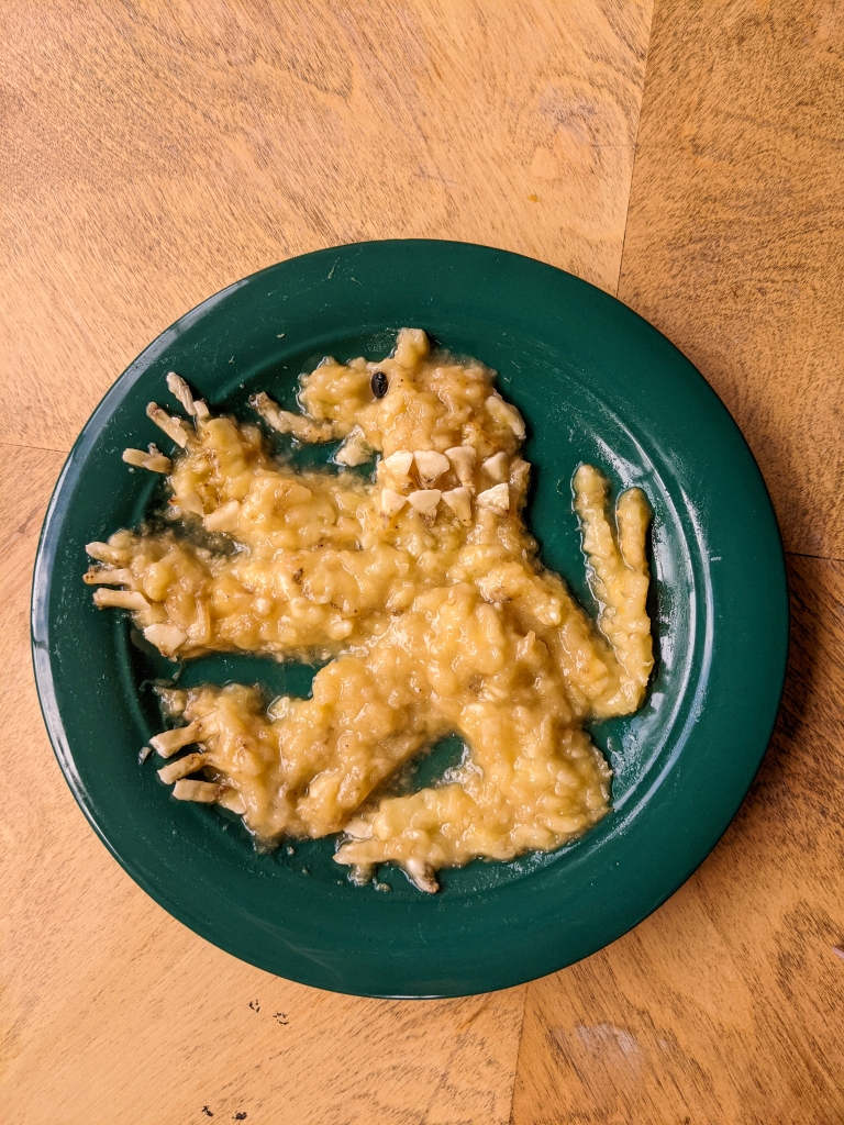 Pynchon scatters similar scenes of preterite camaraderie through many of his novels; this one might be the best. In tribute, with the help of my own ragtag troupe of family and friends, I recreated a mini banana breakfast. We didn’t quite reproduce the whole shebang (I had no concrete scale model of the Jungfrau against which to beat ice for frappes), but it was still a pretty grand affair. We had banana pancakes and banana smoothies. We had bananas flamed in “ancient” brandy.” We even had, thanks to my mother’s remarkable have-a-go attitude and sculpting prowess, mashed bananas in the shape of a British lion rampant (seriously). And oh yeah, we had banana mead!