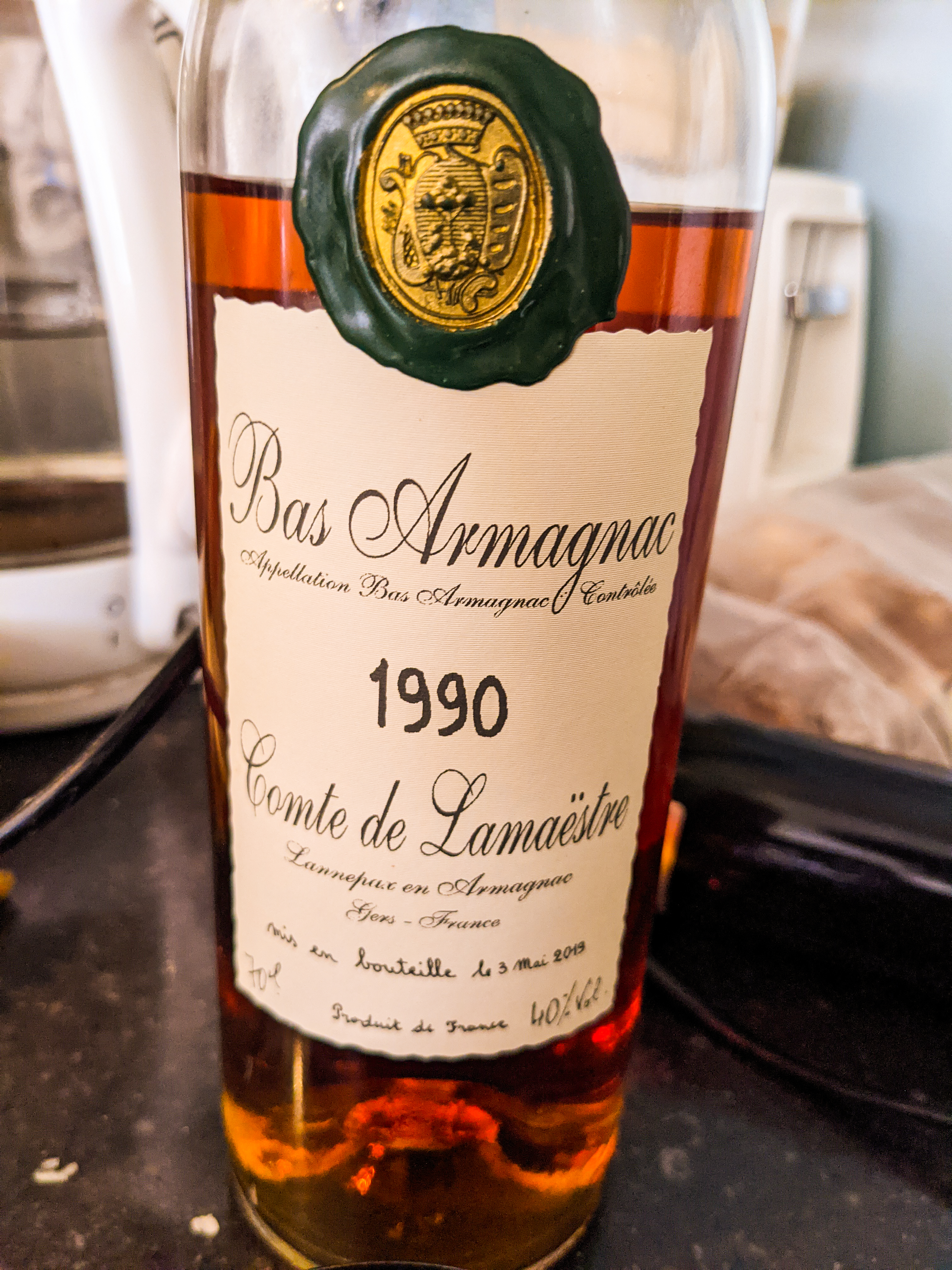 Unless you’re new around here, you’ll be aware that we tend to play pretty fast and loose with dates and vintages. But I’ve gone to some effort to ensure that this brandy is at least a bit ancient. It’s a Comte de Lamaestre Bas Armagnac distilled in 1990. Before you start disputing the antiquity of 1990, consider that I myself was born late that year, meaning the stuff is highly likely to be older than me. Not being in the habit of drinking my elders, that strikes me as ancient enough.
