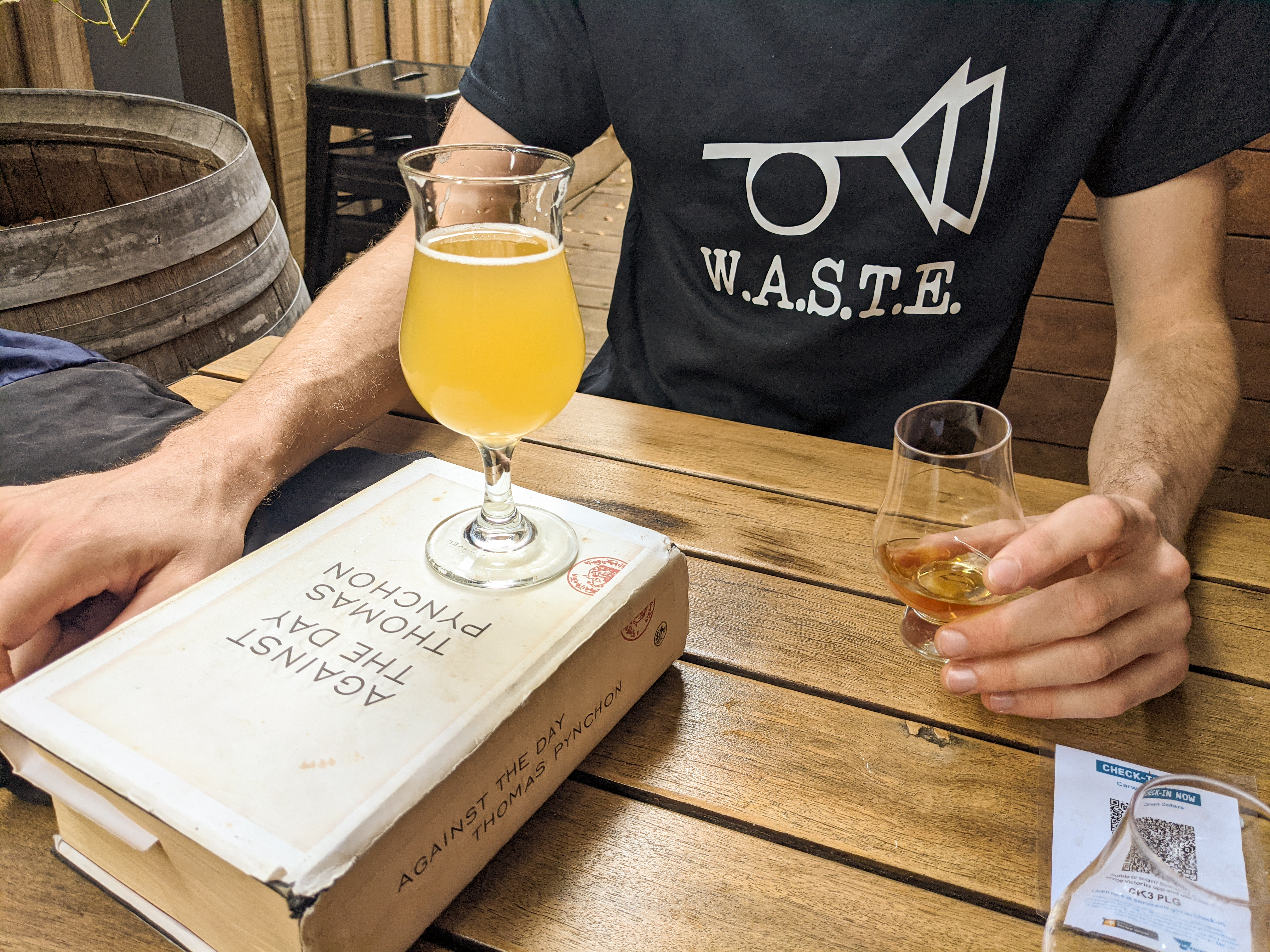 It being Pynchon in Public Day, I have sought my caldereros y sus macheteros in public–and not just any public, but one of my very favourite bits of public: Carwyn Cellars, boozy jewel of Thornbury in Melbourne’s north. Their bartender helpfully suggested a tequila worth drinking and a couple of beers he thought would pair nicely. The tequila was a Tierra Noble Anejo. Beer-wise, my learned friend and drinking buddy had a strawberry sour, I had a table saison. And holy hell it was a good pairing! If the caldereros were as pleasant as everything else sounded in that prison, Dwayne might have been getting into something like this. The tequila was soft and rich and smooth like no tequila I’ve ever tried, and the gentle acidity and floral notes in the beer complemented it beautifully. We followed this first glory up with a second tequila, or actually mezcal for round two, but it was somewhat rougher around the edges—more evocative of teenage nightclub shots than luxurious Guanajuatan prisons.