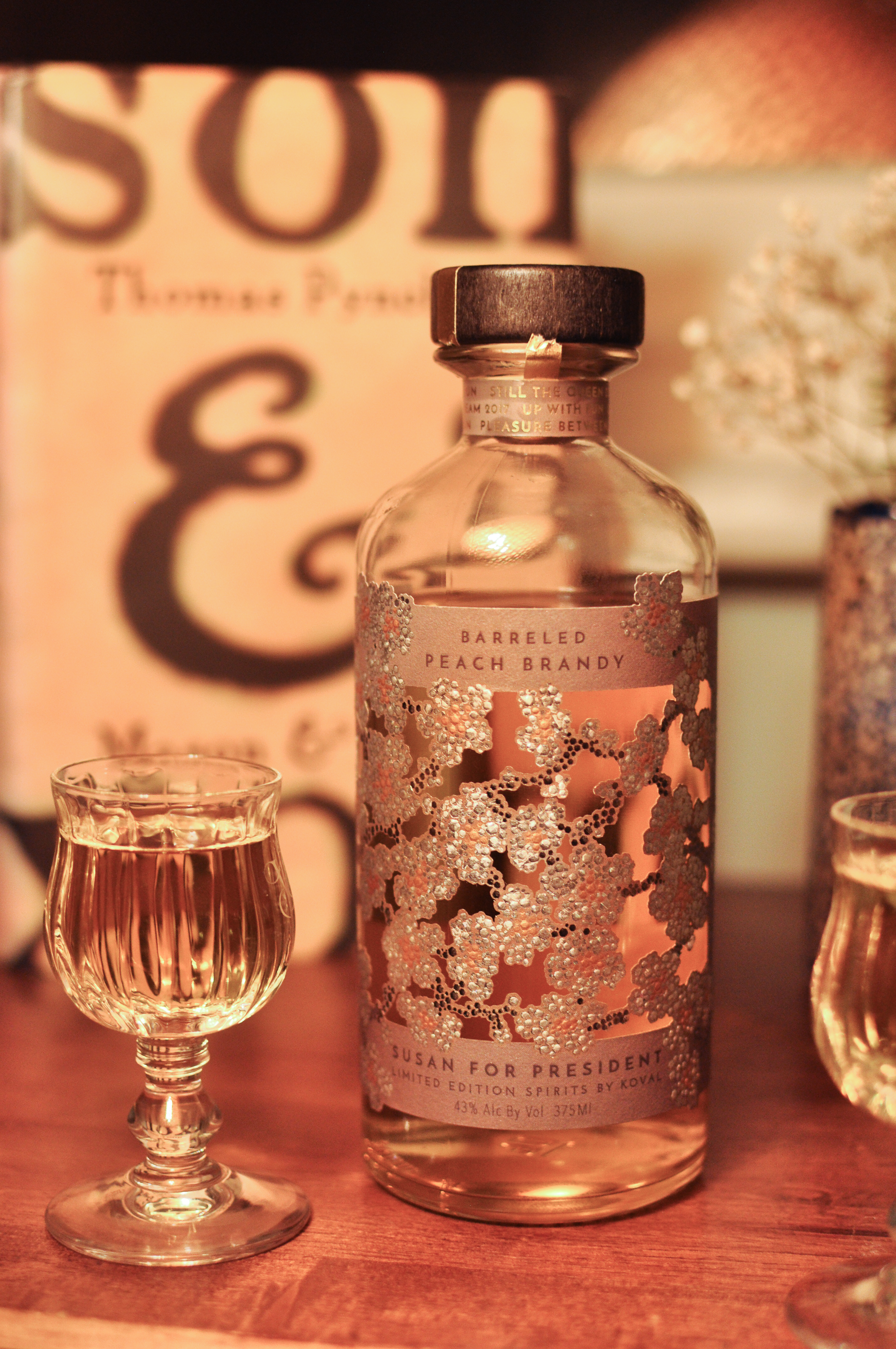 I count myself lucky to have found any real peach brandy at all. Horrible sickly-sweet imitation peach flavoured brandy abounds, but that stuff bears zero resemblance to genuine brandy distilled from peaches. The real deal is very thin on the ground indeed, especially down here is Australia. Somehow though, I earlier this year found a bottle of Chicago distillery Koval’s one-off peach brandy, “Susan for President.” Weirdly, Qantas was selling it.
