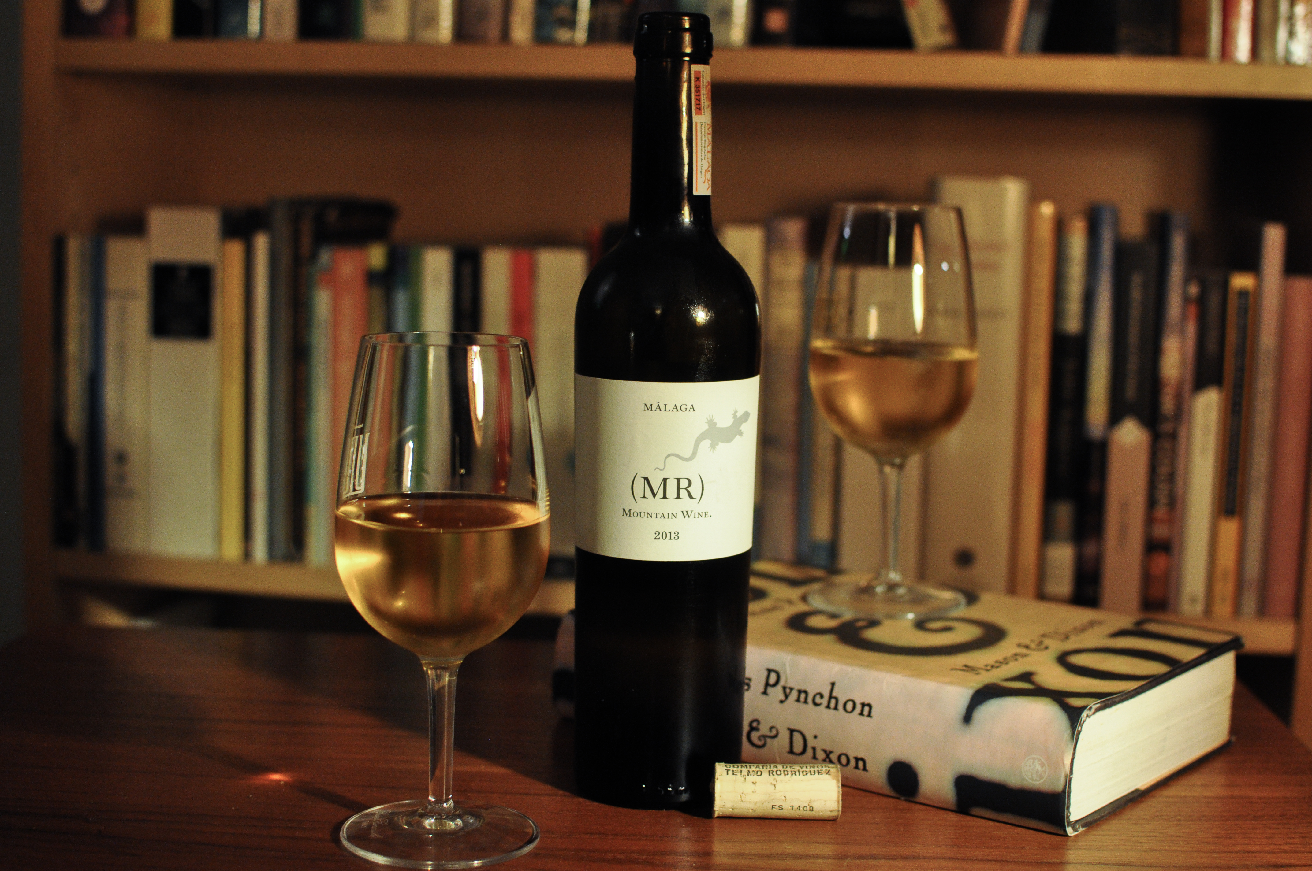 I’m a vegetarian these days, so I’m off the cock ales. I’ll just have to drink this Málaga. It’s the Telmo Rodriguez 2013 MR Mountain, a dessert wine made from partially dried Muscat grapes grown on steep Andalusian slopes.