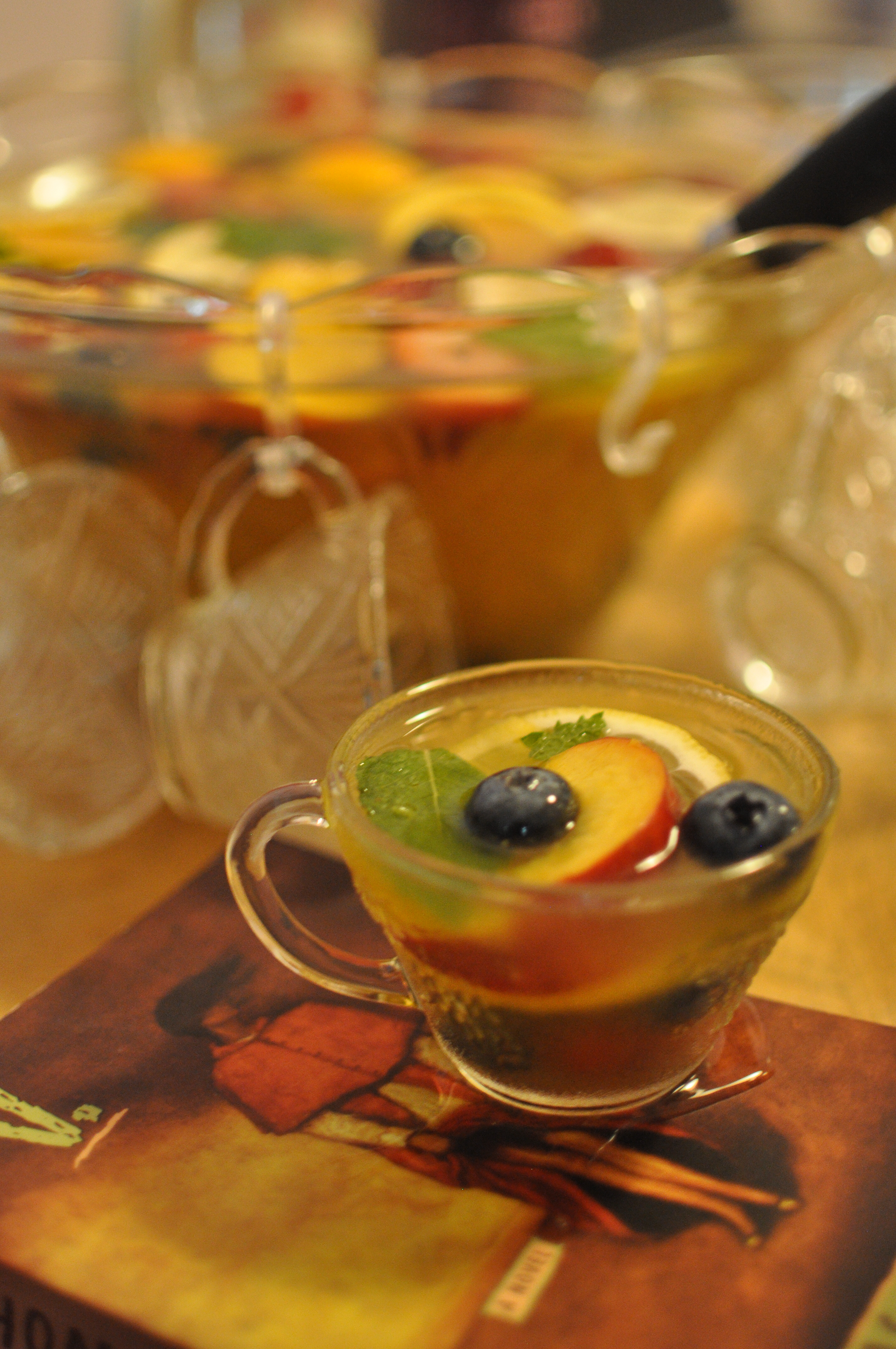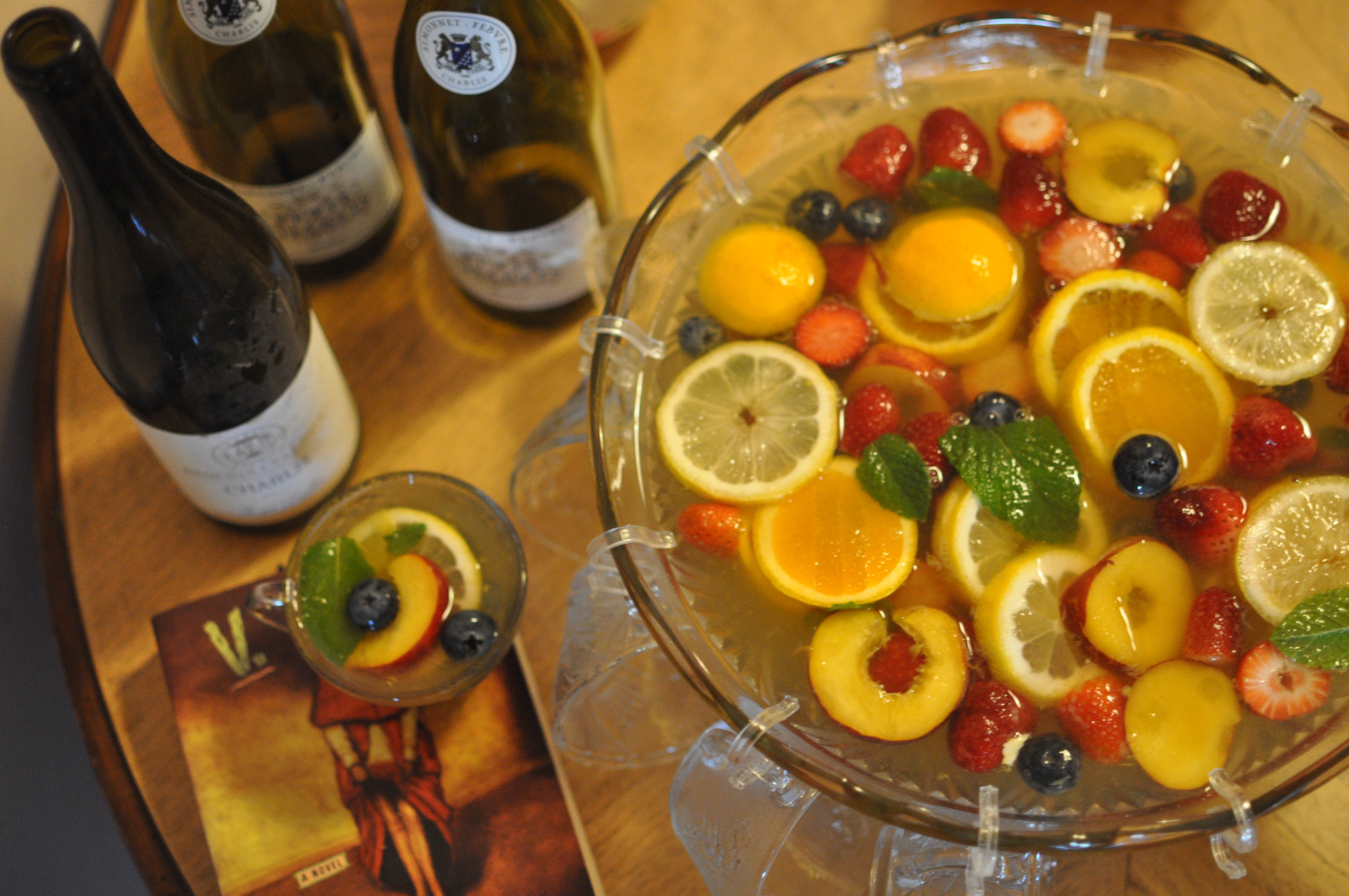 The moment finally came last weekend. I realised that a single bottle of Chablis wasn’t going to make a very convincing impression on a punch bowl, and supplemented the pretty nice bottle of Joseph Drouhin Vaudon I’d started with with a couple of cheaper Simonnet-Febvre Petit Chablis. On top of that went what was left of the cloudberry liqueur, orange juice, grapefruit tonic water, mint, and a whole bunch of fruit.