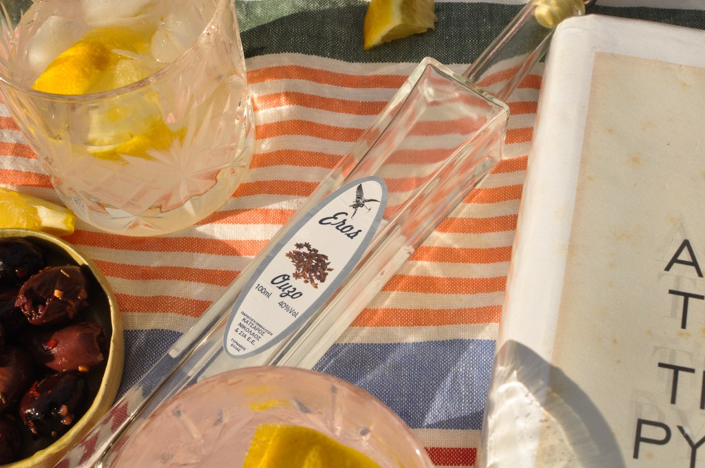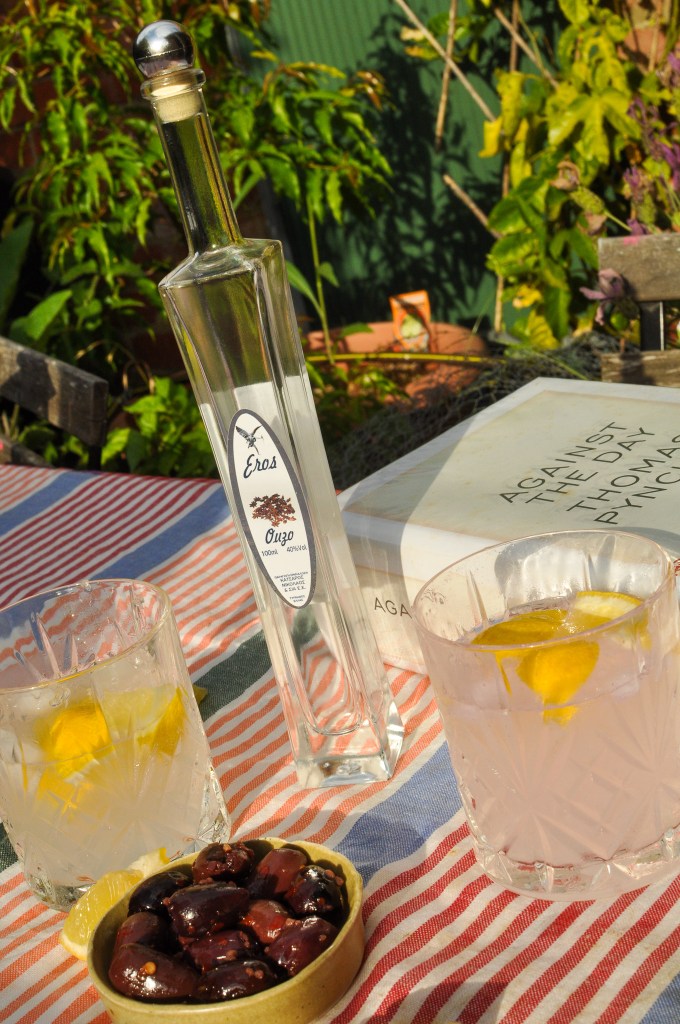 Well it’s a summer evening here too and I may be 15 000 km from Corfu, but the ouzo goes down just as smoothly. The bottle (Eros Ouzo) only held four shots, now about to be exhausted. I’ve mixed it with soda water and added some lemon. It tastes mostly of aniseed, but softly, without becoming vegetal or harsh. There’s a light sweetness. It goes very nicely with late afternoon summer sunshine.