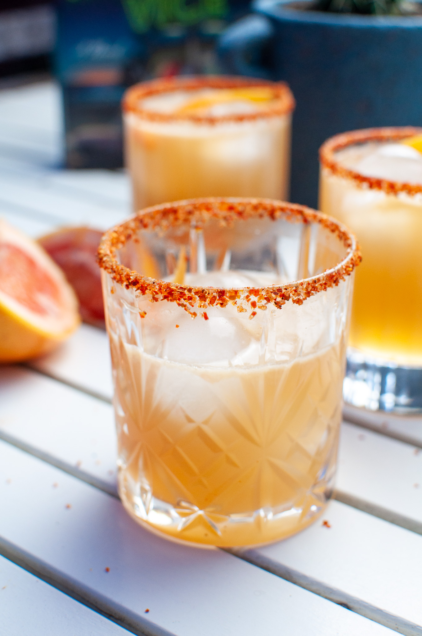 My grapefruit margarita consists of two shots of Cuervo extra anejo (leftover from a post a few months back), one shot of Cointreau, half a shot of lime juice, and half a shot of grapefruit, plus a tajin rim for the glass.