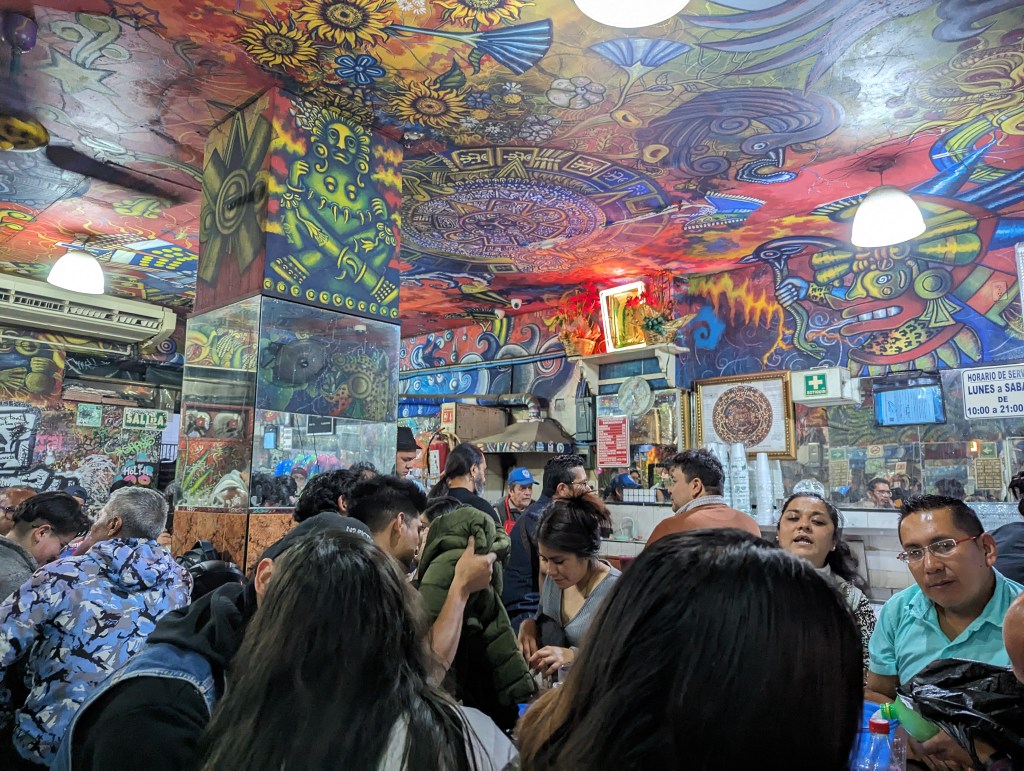 The bar this whole time was periodically erupting into chanting and song. The place was hectic. Adding to the intensity, the walls and ceilings were painted all over in sort of acid-Aztec designs. It really was one of the more out there drinking experiences of my life. After spending a reasonable amount of time at posh Roma Norte cafes and bars, Duelistas felt like a different Mexico entirely, like we had slipped into the other Mesoamerican image glimmering in the Iceland spar.